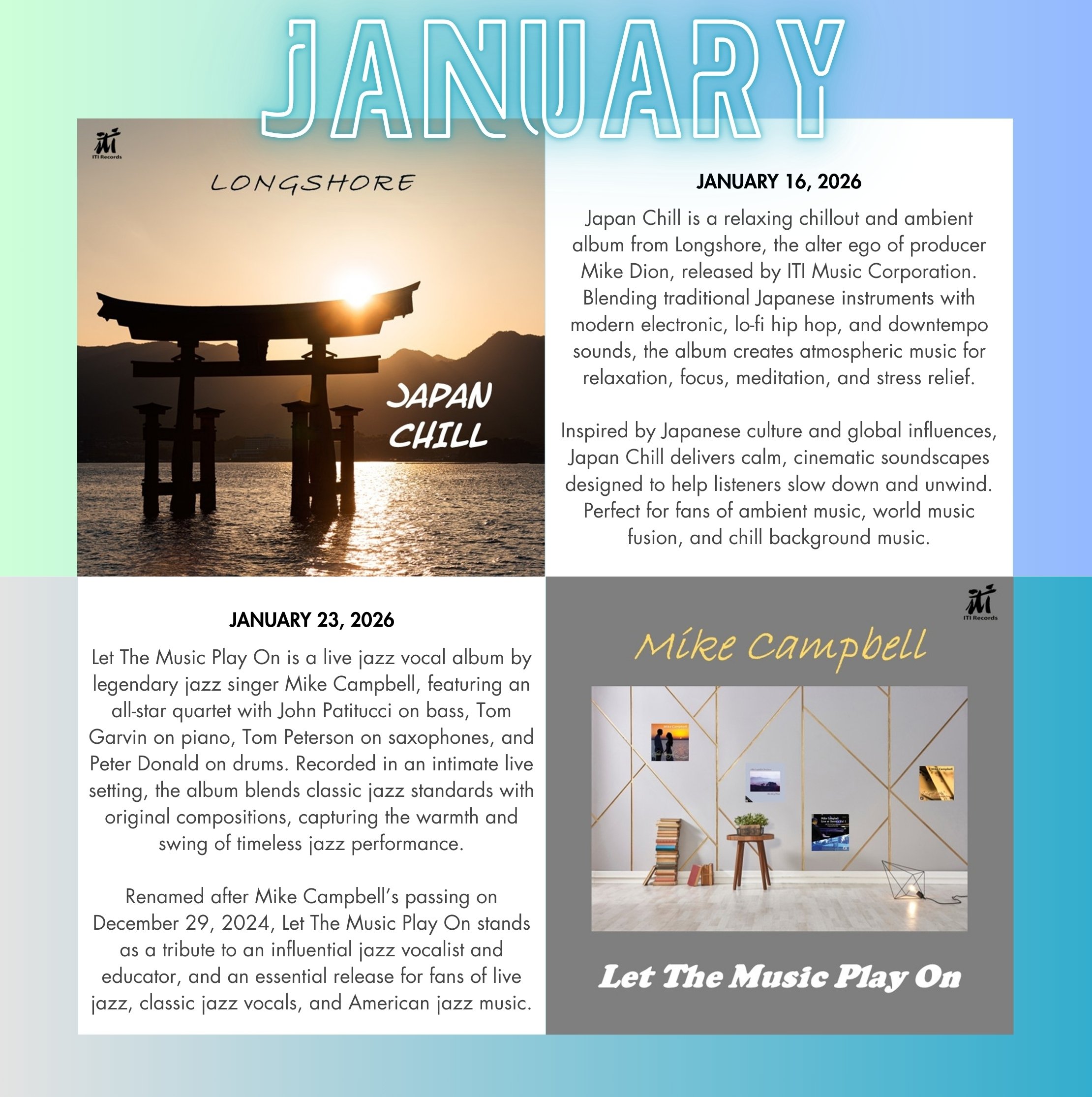 Recent releases include Let The Music Play On, a live jazz vocal album by legendary jazz singer Mike Campbell, featuring an all star jazz quartet, and Japan Chill by Longshore, a Japanese inspired ambient and chillout album blending traditional instruments with modern electronic and lofi sounds. ITI Music Records is home to jazz vocals, classic jazz standards, ambient music for relaxation, world music fusion, and cinematic instrumental albums designed for listeners, playlists, film, television, and digital platforms worldwide.